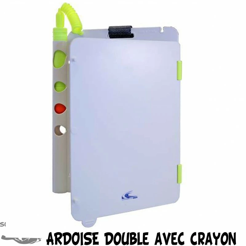 Ardoise sous marine à double volet repliables, munie de son crayon effaçable & d’une sangle avec mousqueton très pratique.