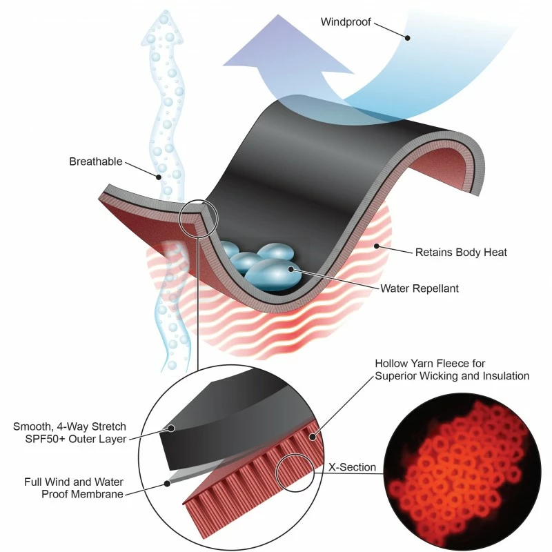 La seconde couche est celle qui vous protège du vent. Elle est 100% Windproof. Elle permet au corps de respirer pour régler la température corporelle.