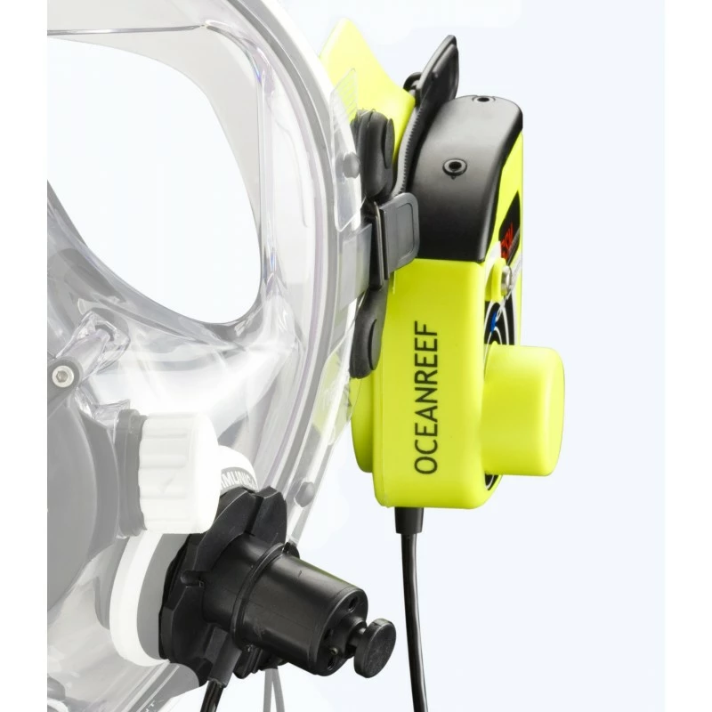 Le système breveté NACS™ est un support réglable pour le GSM G.divers, ainsi que pour les autres appareils de communication sous-marine OCEAN REEF. Il peut être fixé sur le côté gauche du masque, lui évitant de rester suspendu à la sangle.