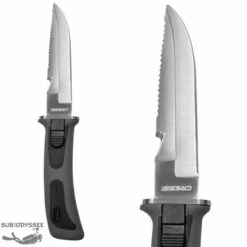 Le VIGO de Cressi est un petit couteau, plat & ergonomique, qui se met dans sa gaine & se retire facilement, & un système de retrait qui évite les pertes accidentelles, du fait que deux boutons doivent être pressés simultanément pour extraire le couteau de sa gaine.